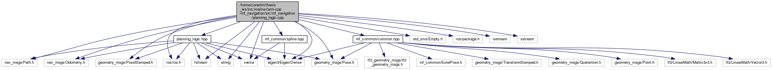 #include "planning_logic.hpp"#include "mf_common/common.hpp"#include "mf_common/spline.hpp"#include <nav_msgs/Path.h>#include <nav_msgs/Odometry.h>#include <geometry_msgs/PoseStamped.h>#include <geometry_msgs/Pose.h>#include <std_srvs/Empty.h>#include <ros/package.h>#include <ros/ros.h>#include <eigen3/Eigen/Dense>#include <fstream>#include <iostream>#include <sstream>#include <string>#include <vector>